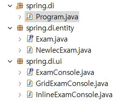package spring.di.ui; import spring.di.entity.Exam; public class GridExamConsole implements ExamConsole { private Exam exam; public GridExamConsole(Exam exam) { this.exam = exam; } @Override public void print() { System.out.println("[[Grid Print]]"); System.out.printf("total is %d, avg is %f\n", exam.total(), exam.avg()); } }InlineExamConsole.java