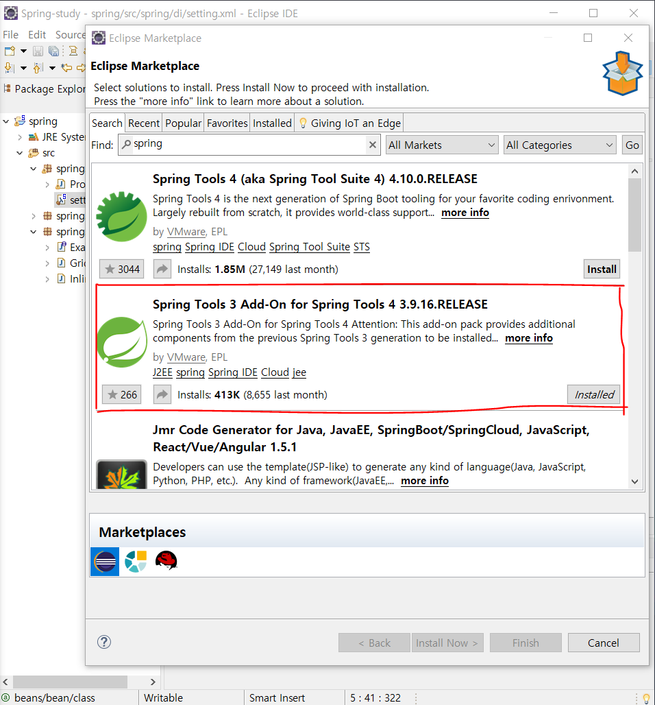 Help > Eclipse Marketplace > Spring Tools 3 Add-On for Spring Tools... 를 설치한다.