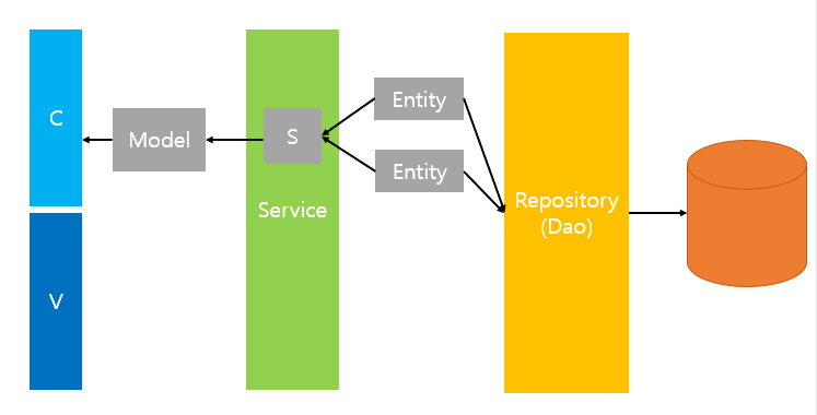 - Service: 사용자의 요청에 맞는 서비스를 제공. 보통 업무 단위, 트랜지션 단위로 업무를 담당
