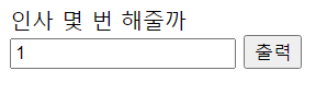 <!DOCTYPE html> <html> <head> <meta charset="UTF-8"> <title>Insert title here</title> </head> <body> <div> <form action="hi"> <div> <label>인사 몇 번 해줄까</label> </div> <div> <input type="text" name="cnt"/> <input type="submit" value="출력"/> </div> </form> </div> </body> </html>사용자의 입력을 받아와 그 횟수만큼의 인사를 출력해보자
