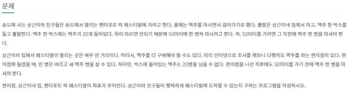 송도에 사는 상근이와 친구들은 송도에서 열리는 펜타포트 락 페스티벌에 가려고 한다. 올해는 맥주를 마시면서 걸어가기로 했다. 출발은 상근이네 집에서 하고, 맥주 한 박스를 들고 출발한다.