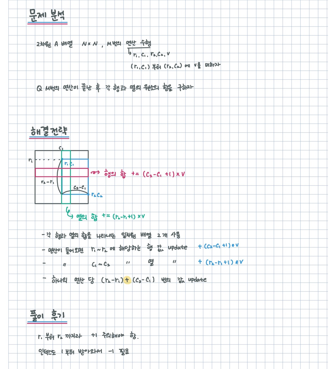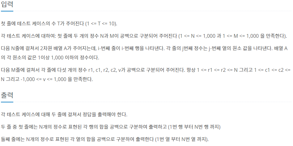 import java.util.*; import java.io.*; public class Main { public static void main(String[] args) throws Exception { BufferedReader br = new BufferedReader(new InputStreamReader(System.in)); int T = Integer.parseInt(br.readLine()); StringBuilder sb = new StringBuilder(); while(T-->0){ StringTokenizer st = new StringTokenizer(br.readLine()); int N = Integer.parseInt(st.nextToken()); int M = Integer.parseInt(st.nextToken()); int[][] arr = new int[N][N]; int[] rows = new int[N]; int[] cols = new int[N]; //arr 값 받아오기와 rows, cols 초기화 for(int i=0;i<N;i++){ st = new StringTokenizer(br.readLine()); for(int j=0;j<N;j++){ int val = Integer.parseInt(st.nextToken()); arr[i][j] = val; rows[i] += val; cols[j] += val; } } for(int i=0;i<M;i++){ st = new StringTokenizer(br.readLine()); int r1 = Integer.parseInt(st.nextToken())-1; int c1 = Integer.parseInt(st.nextToken())-1; int r2 = Integer.parseInt(st.nextToken())-1; int c2 = Integer.parseInt(st.nextToken())-1; int v = Integer.parseInt(st.nextToken()); for(int r=r1; r<=r2; r++){ rows[r] += (c2-c1+1)*v; } for(int c=c1; c<=c2; c++){ cols[c] += (r2-r1+1)*v; } } for(int i=0;i<N;i++) sb.append(rows[i]+" "); sb.append('\n'); for(int i=0;i<N;i++) sb.append(cols[i]+" "); sb.append('\n'); } System.out.println(sb); } }'알고리즘 공부 > 문제 풀이' 카테고리의 다른 글