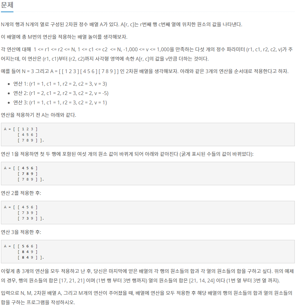 N개의 행과 N개의 열로 구성된 2차원 정수 배열 A가 있다. A[r, c]는 r번째 행 c번째 열에 위치한 원소의 값을 나타낸다. 이 배열에 총 M번의 연산을 적용하는 배열 놀이를 생각해보자. 각 연산에 대