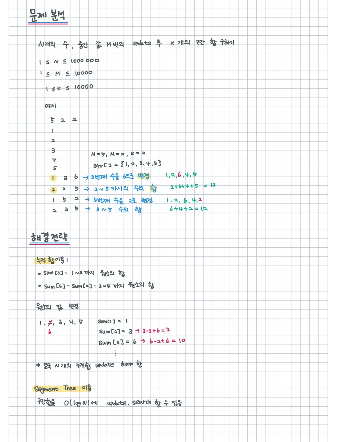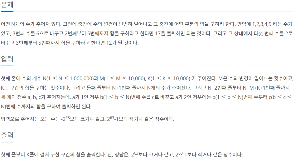 첫째 줄에 수의 개수 N(1 ≤ N ≤ 1,000,000)과 M(1 ≤ M ≤ 10,000), K(1 ≤ K ≤ 10,000) 가 주어진다. M은 수의 변경이 일어나는 횟수이고, K는 구간의 합을 구하는 횟수이다. 그리고 둘째 줄부터 N+1번째 줄