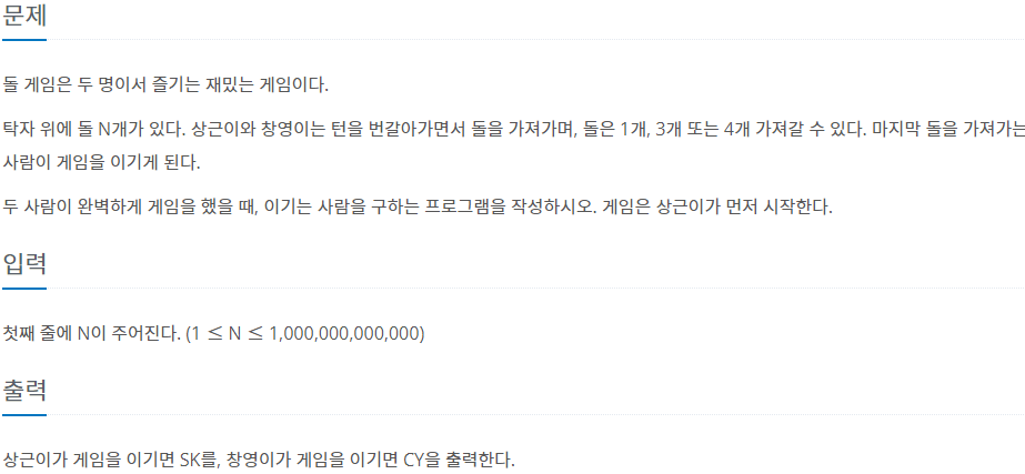 import java.util.*; public class Main { public static void main(String[] args) { Scanner sc = new Scanner(System.in); long N = sc.nextLong(); String answer = "SK"; if(N%7==0 || N%7==2) answer = "CY"; System.out.println(answer); } }'알고리즘 공부 > 문제 풀이' 카테고리의 다른 글