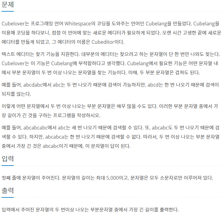 오늘 살펴볼 문제는 백준 1701 문제이다. https://www.acmicpc.net/problem/1701 1701번: Cubeditor 문제 Cubelover는 프로그래밍 언어 Whitespace의 코딩을 도와주는 언어인 Cubelang을 만들었다. Cubelang을 이..