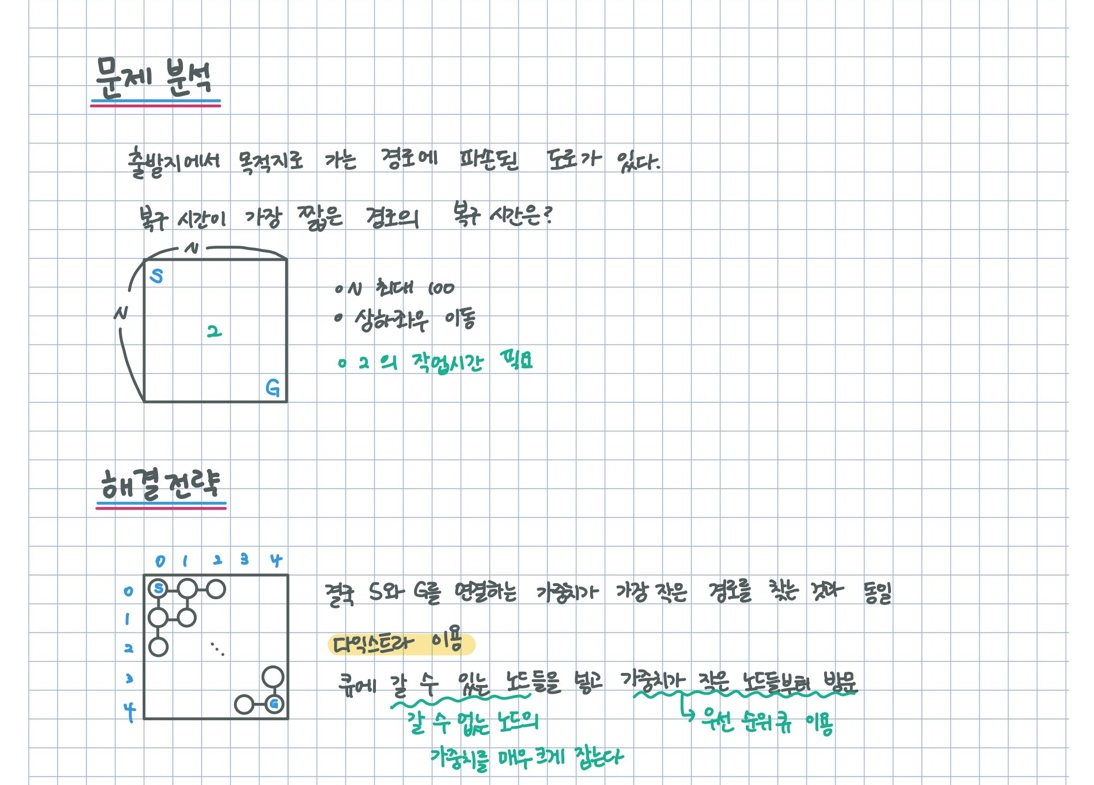 거의 유사한 문제. 2차원을 그래프로 생각하여 시작점에서 도착점까지의 가장 적은 비용으로 가는 경로를 찾는 문제