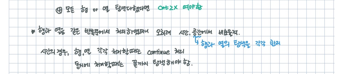 import java.util.*; import java.io.*; public class Solution { public static void main(String[] args) throws Exception { BufferedReader br = new BufferedReader(new InputStreamReader(System.in)); int T = Integer.parseInt(br.readLine()); for(int t=1; t<=T; t++) { StringTokenizer st = new StringTokenizer(br.readLine()); int N = Integer.parseInt(st.nextToken()); int X = Integer.parseInt(st.nextToken()); int[][] map = new int[N][N]; for(int i=0;i<N;i++) { st = new StringTokenizer(br.readLine()); for(int j=0;j<N;j++) map[i][j] = Integer.parseInt(st.nextToken()); } int ans = 0; next: for(int i=0; i<N;i++) { int cnt = 1; boolean down = false; for(int j=1; j<N;j++) { if(map[i][j-1]==map[i][j]) cnt++; else if(map[i][j-1]+1==map[i][j]) { //오르막, 이전의 개수 확인 if(down && cnt<2*X) continue next; if(!down && cnt<X) continue next; down = false; cnt = 1; } else if(map[i][j-1]-1==map[i][j]) { //내리막, 이후 개수 확인 if(down && cnt<X) continue next; down = true; cnt = 1; } else continue next; } if(!down || down && cnt>=X) ans++; } next: for(int i=0; i<N;i++) { int cnt = 1; boolean down = false; for(int j=1; j<N;j++) { if(map[j-1][i]==map[j][i]) cnt++; else if(map[j-1][i]+1==map[j][i]) { //오르막, 이전의 개수 확인 if(down && cnt<2*X) continue next; if(!down && cnt<X) continue next; down = false; cnt = 1; } else if(map[j-1][i]-1==map[j][i]) { //내리막, 이후 개수 확인 if(down && cnt<X) continue next; down = true; cnt = 1; } else continue next; } if(!down || down && cnt>=X) ans++; } System.out.println("#"+t+" "+ans); } } }'알고리즘 공부 > 문제 풀이' 카테고리의 다른 글