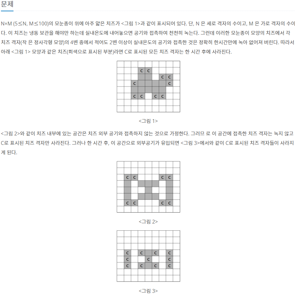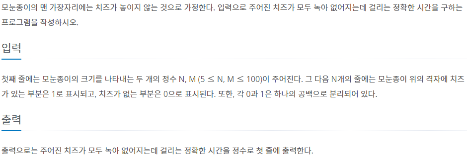 첫째 줄에는 모눈종이의 크기를 나타내는 두 개의 정수 N, M (5 ≤ N, M ≤ 100)이 주어진다. 그 다음 N개의 줄에는 모눈종이 위의 격자에 치즈가 있는 부분은 1로 표시되고, 치즈가 없는 부분은 0으로