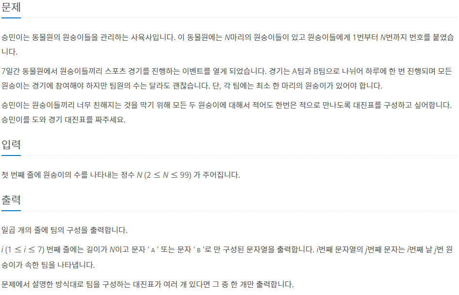 import java.util.*; public class Main { public static void main(String[] args) { Scanner sc = new Scanner(System.in); int N = sc.nextInt(); monkeys = new char[7][N]; StringBuilder sb = new StringBuilder(); for(int i=0;i<N;i++) sb.append('A'); make(0, N-1, 0); for(int i=0;i<7;i++){ String str = new String(monkeys[i]); if(str.equals(sb.toString())){ str = str.substring(1); str += "B"; } System.out.println(str); } } static char[][] monkeys; static int cnt = 0; public static void make(int start, int end, int layer){ if(layer==7){ cnt++; return; } int mid = (start+end)/2; for(int i=start;i<=mid;i++) monkeys[layer][i] = 'A'; for(int i=mid+1;i<=end;i++) monkeys[layer][i] = 'B'; make(start, mid, layer+1); make(mid+1, end, layer+1); } }'알고리즘 공부 > 문제 풀이' 카테고리의 다른 글