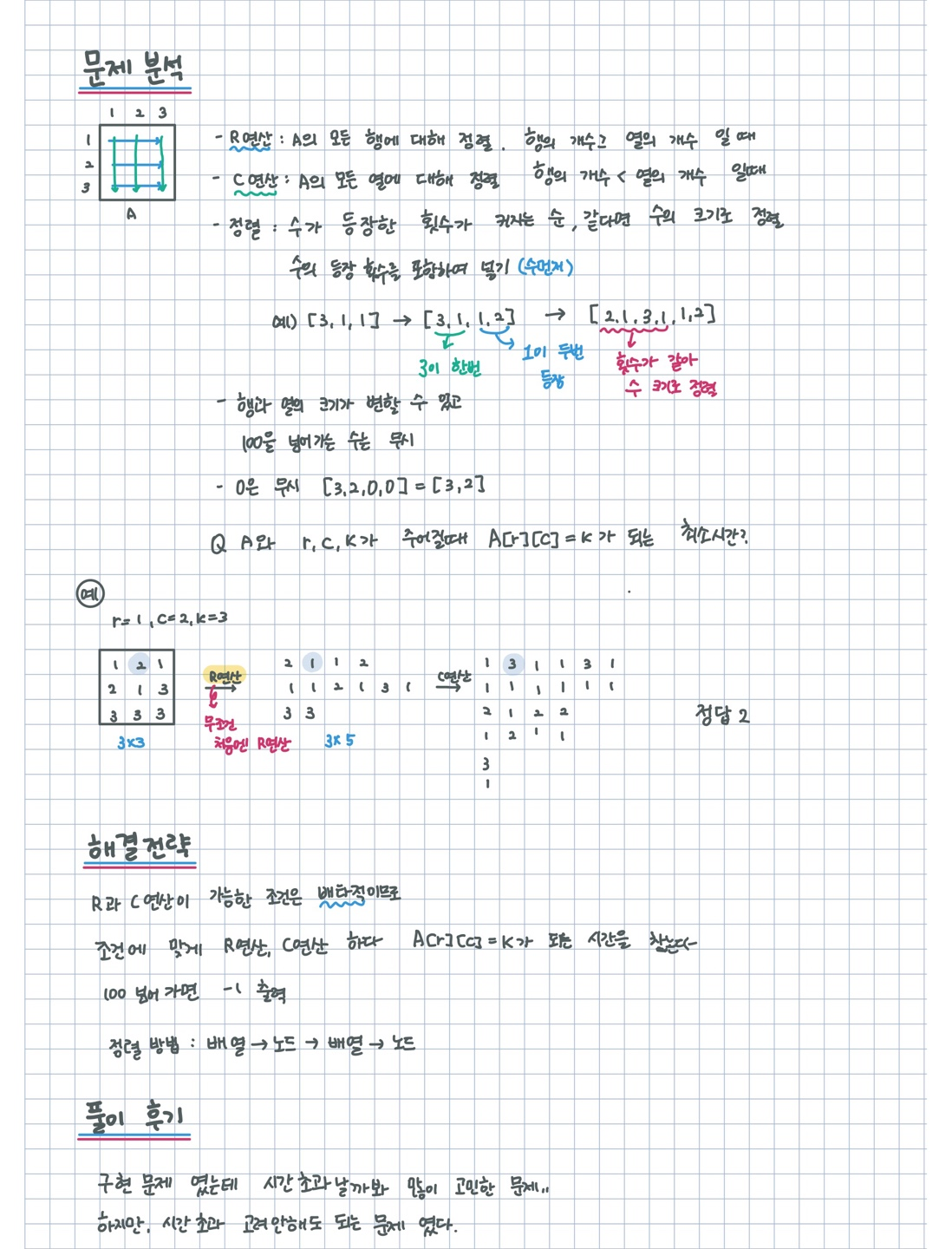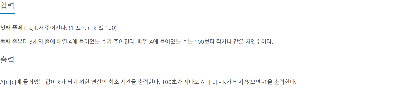 첫째 줄에 r, c, k가 주어진다. (1 ≤ r, c, k ≤ 100) 둘째 줄부터 3개의 줄에 배열 A에 들어있는 수가 주어진다. 배열 A에 들어있는 수는 100보다 작거나 같은 자연수이다.