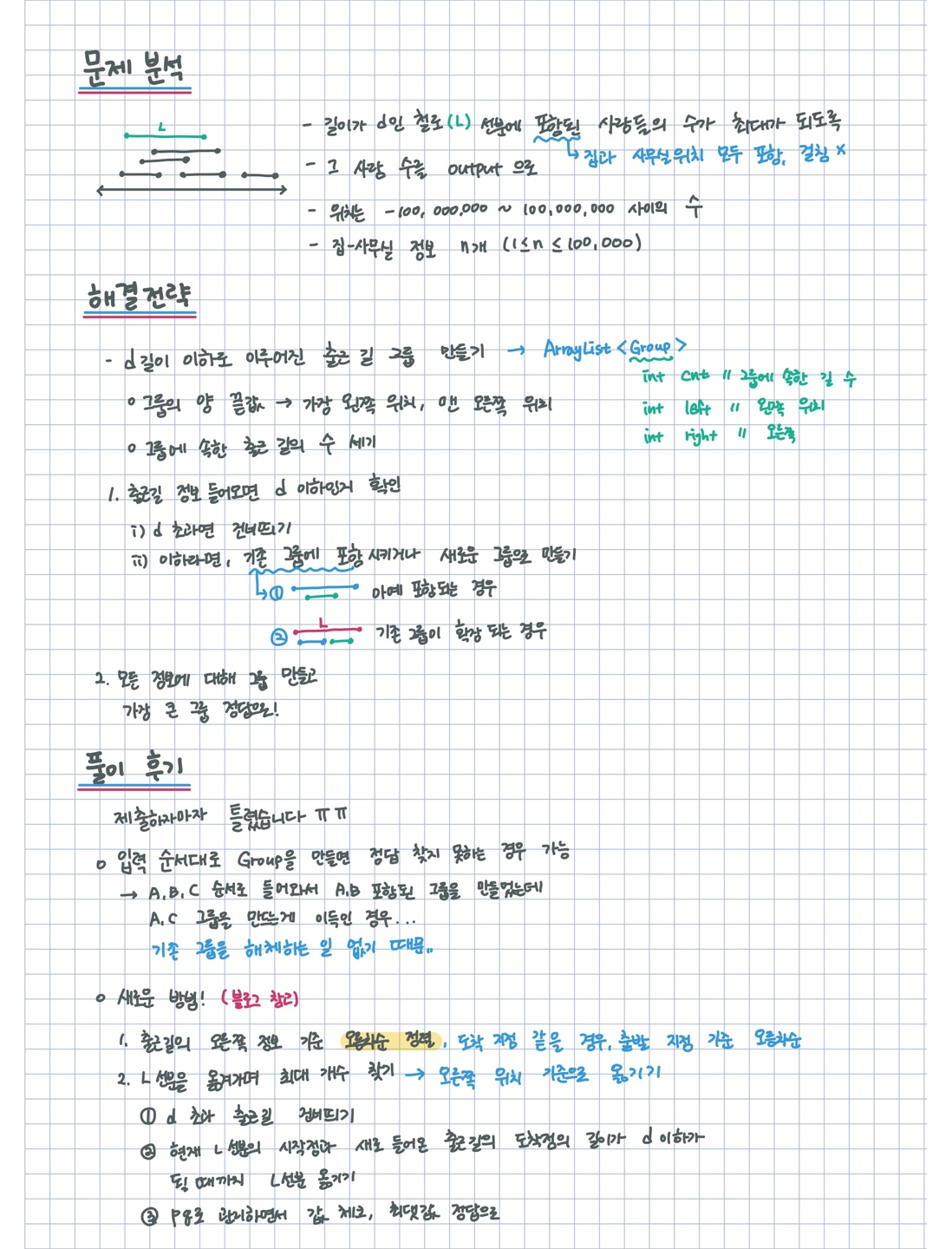 이 문제 같은 경우는 오른쪽에 선분을 맞춰 이동시키며 왼쪽에서 정답 만족하지 않는 출근길들 빼내기