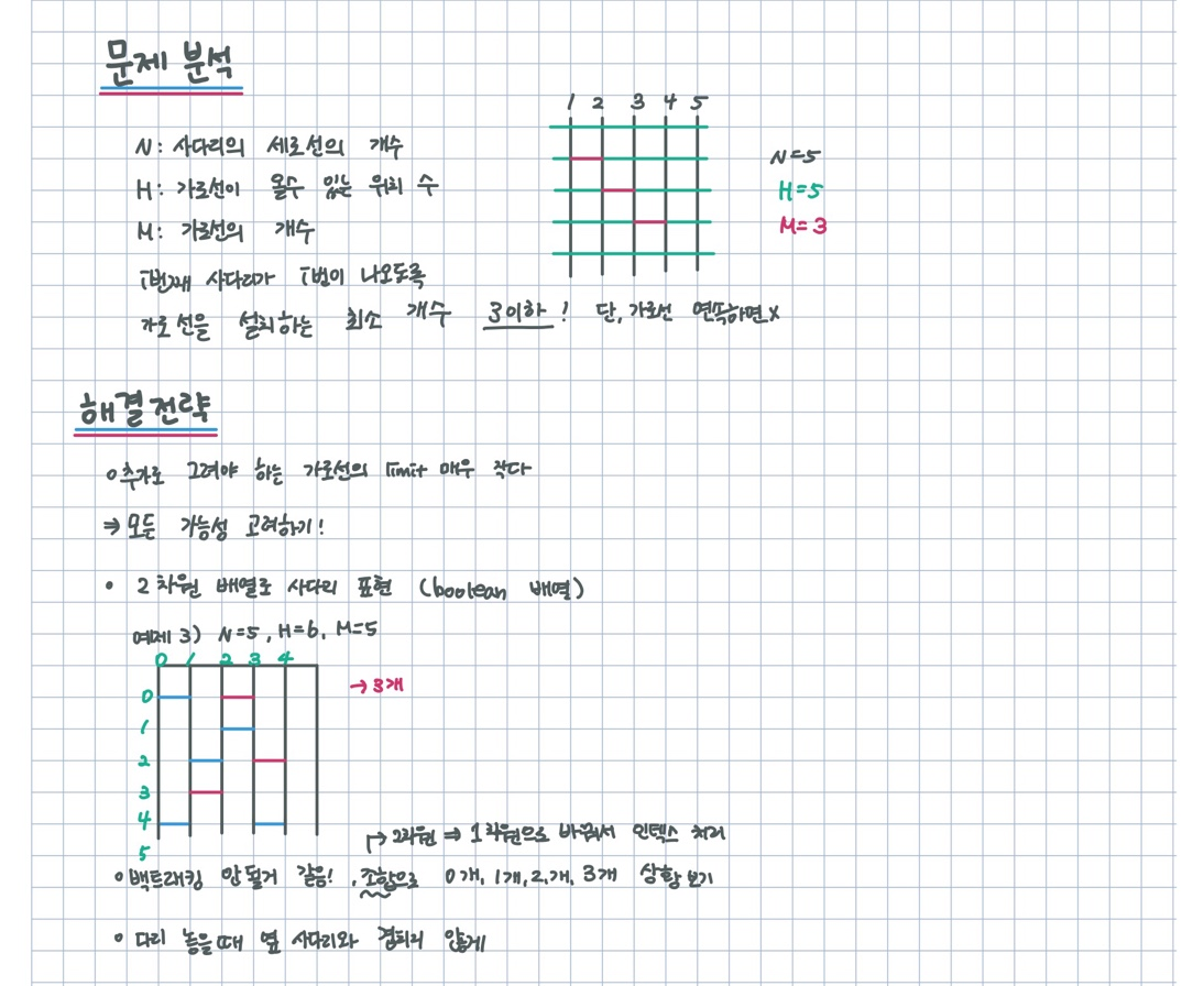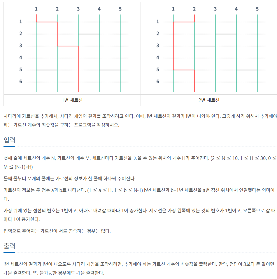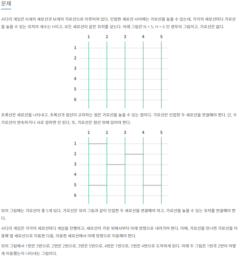 사다리 게임은 N개의 세로선과 M개의 가로선으로 이루어져 있다. 인접한 세로선 사이에는 가로선을 놓을 수 있는데, 각각의 세로선마다 가로선을 놓을 수 있는 위치의 개수는 H이고, 모든 세로선