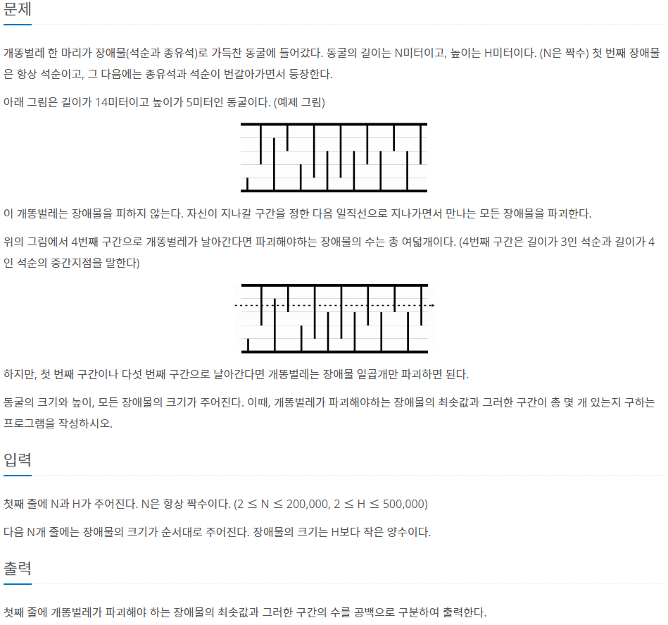 import java.util.*; import java.io.*; public class Main { public static void main(String[] args) throws Exception { BufferedReader br = new BufferedReader(new InputStreamReader(System.in)); StringTokenizer st = new StringTokenizer(br.readLine()); N = Integer.parseInt(st.nextToken()); H = Integer.parseInt(st.nextToken()); bot = new int[H+1]; top = new int[H+1]; min = N; cnt = 0; for(int i=0;i<N/2;i++){ bot[Integer.parseInt(br.readLine())]++; top[Integer.parseInt(br.readLine())]++; } process(); System.out.println(min+" "+cnt); } static int N, H; static int[] bot, top; static int min, cnt; public static void process(){ int[] bot_sum = new int[H+1]; // 높이가 h 이하인 석순의 수 int[] top_sum = new int[H+1]; for(int i=1;i<=H;i++){ bot_sum[i] = bot_sum[i-1] + bot[i]; top_sum[i] = top_sum[i-1] + top[i]; } for(int i=1;i<H+1;i++){ int crush = 0; crush += bot_sum[H] - bot_sum[i-1]; crush += bot_sum[H] - top_sum[H-i]; if(min>crush){ cnt = 1; min = crush; } else if(min==crush){ cnt++; } } } }'알고리즘 공부 > 문제 풀이' 카테고리의 다른 글