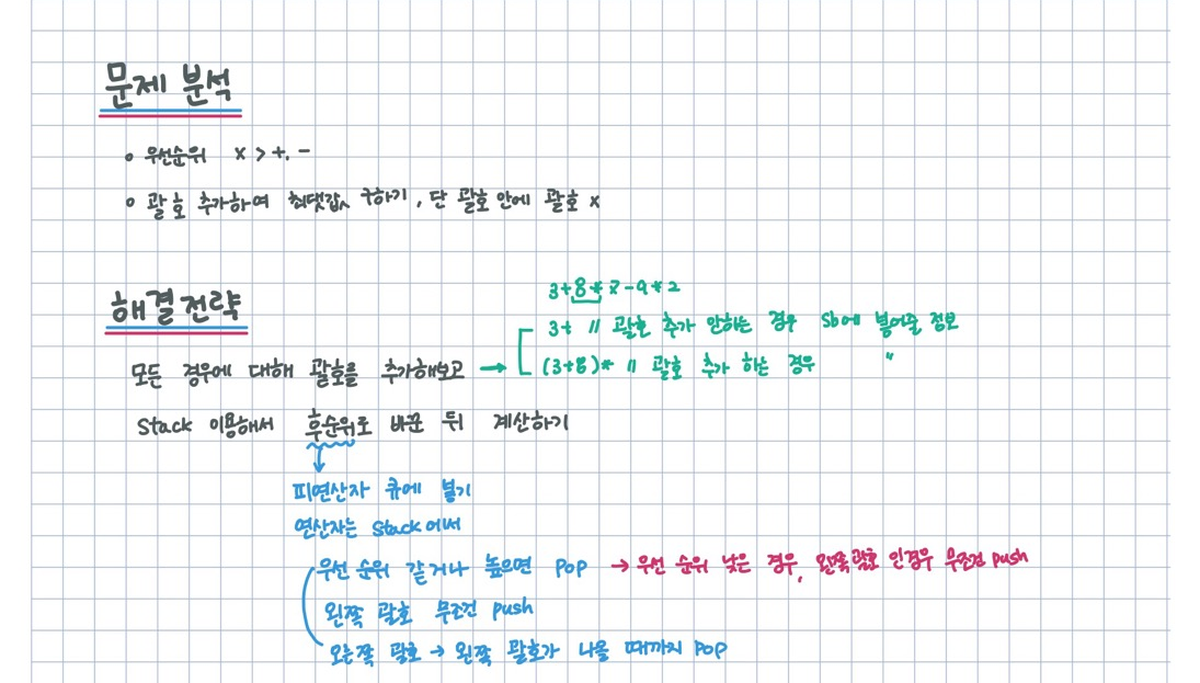 이번 문제에서는 괄호를 넣어준 스트링을 구하고 그 스트링을 후위표기법으로 바꾸면서 계산하는 방법으로 하였다