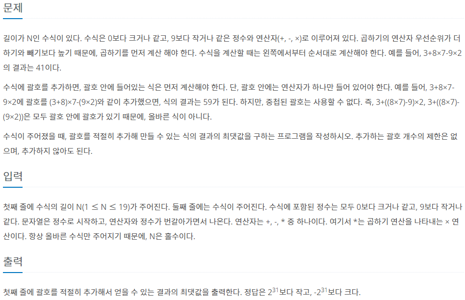 첫째 줄에 수식의 길이 N(1 ≤ N ≤ 19)가 주어진다. 둘째 줄에는 수식이 주어진다. 수식에 포함된 정수는 모두 0보다 크거나 같고, 9보다 작거나 같다. 문자열은 정수로 시작하고, 연산자와 정수가