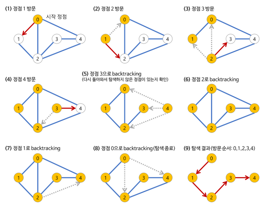 너비 우선 탐색과 비교하여 구현은 간단하지만 검색 속도는 느리다.