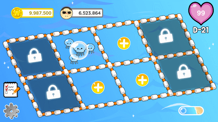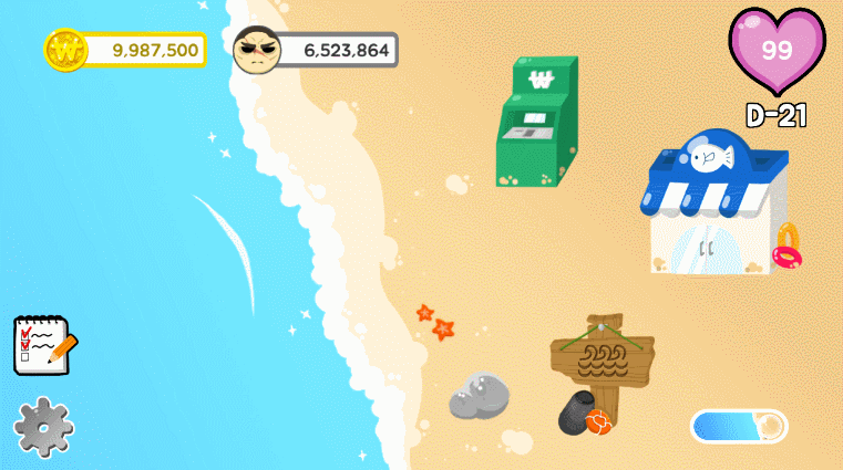 기존 아이콘으로 존재하던 상점, 바다, 송금을 해변에 위치시킴으로써 그래픽적으로 게임이 풍부하게 느껴지도록 하였다. 또한 아이콘이 눌리는 것에도 효과를 추가하였다.