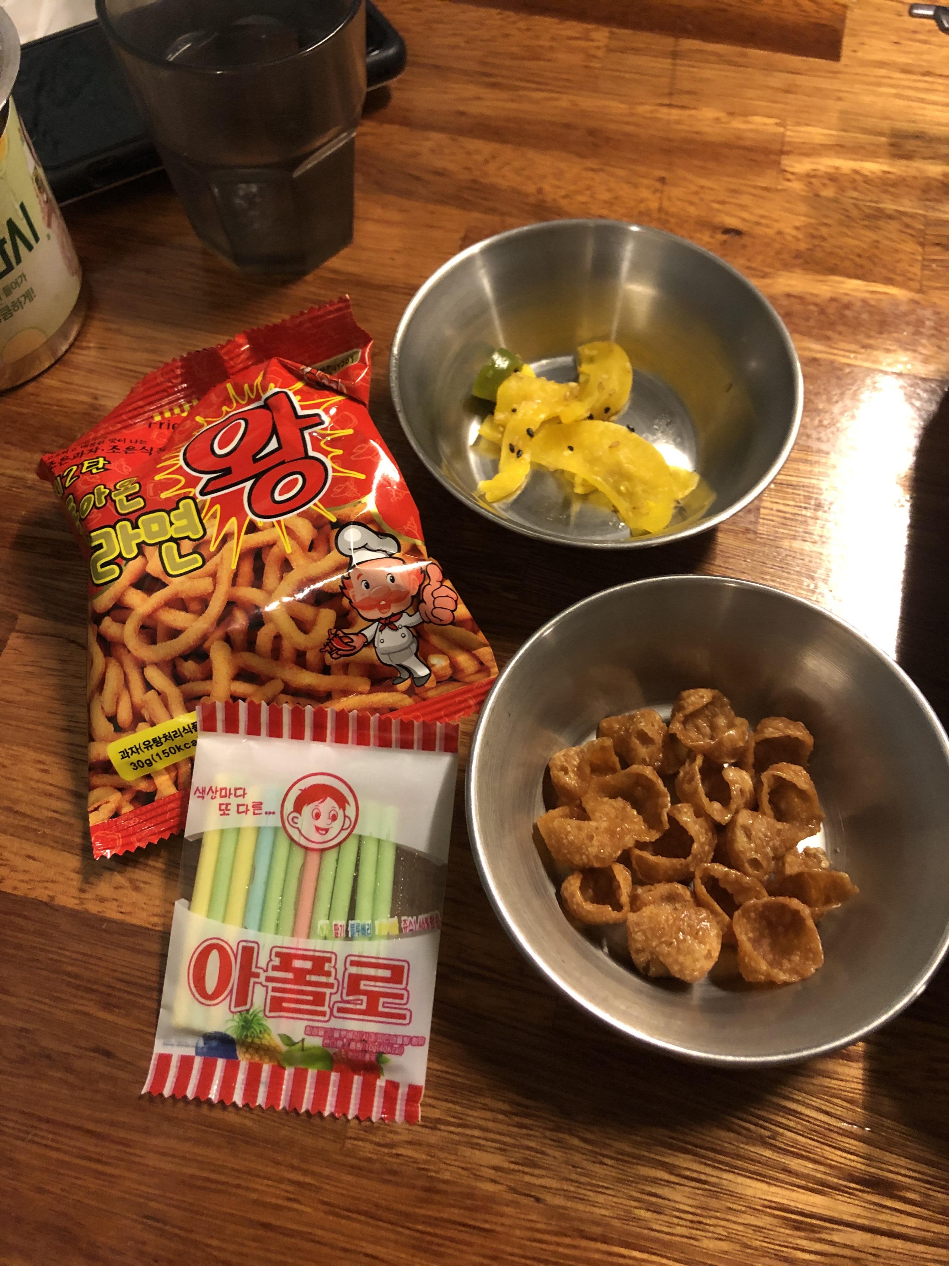 이 술집은 신기한 게 기본 안주로 작은 봉지과자를 줘요